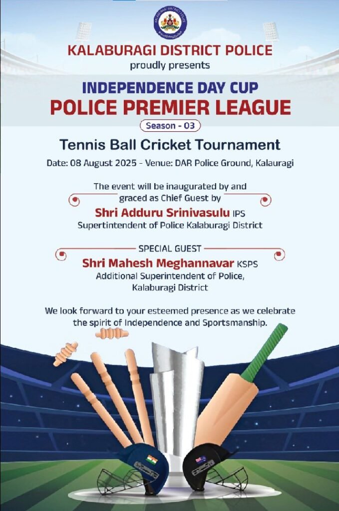 ಇಂದು ಡಿ.ಎ.ಆರ್ ಮೈದಾನದಲ್ಲಿ 3 ದಿನಗಳ ಕಾಲ ನಡೆಯುವ “INDEPENDENCE DAY CUP” POLICE PREMIER LEAGUE SEASON – 03 ಟೆನ್ನಿಸ್ ಬಾಲ್ ಕ್ರಿಕೆಟ್ ಟೂರ್ನಮೆಂಟ್ ನ್ನು ಶ್ರೀ ಅಡ್ಡೂರು ಶ್ರೀನಿವಾಸುಲು IPS, ಪೊಲೀಸ ಅಧೀಕ್ಷಕರು ಕಲಬುರಗಿ ಜಿಲ್ಲೆ ರವರು ಉದ್ಘಾಟಿಸಿ, ಈ ಕ್ರಿಕೆಟ್ ಕ್ರೀಡಾ ಕೂಟದಲ್ಲಿ ಒಟ್ಟು 10 ಪೊಲೀಸ್ ತಂಡಗಳು ಭಾಗವಹಿಸಿದ್ದು ಎಲ್ಲಾ ತಂಡಗಳಿಗೆ ಶುಭ ಕೋರಲಾಯಿತು. ಈ ಸಂದರ್ಭದಲ್ಲಿ ಹೆಚ್ಚುವರಿ ಪೊಲೀಸ್ ಅಧೀಕ್ಷಕರಾದ ಶ್ರೀ ಮಹೇಶ ಮೇಘಣ್ಣವರ ಮತ್ತು DAR DSP ರವರಾದ ಶರಣಪ್ಪ ಹಾಗೂ ಇತರ ಪೊಲೀಸ್ ಅಧಿಕಾರಿಗಳು ಉಪಸ್ಥಿತರಿದ್ದರು.