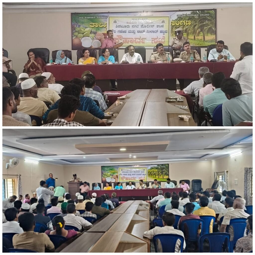 ತಿಪಟೂರು ನಗರದಲ್ಲಿ ಗಣಪತಿ ವಿಸರ್ಜನಾ ಕಾರ್ಯಕ್ರಮ ಹಾಗೂ ಈದ್ ಮಿಲಾದ್ ಹಬ್ಬದ ಹಿನ್ನಲೆಯಲ್ಲಿ ಹೆಚ್ಚುವರಿ ಪೊಲೀಸ್ ಅಧೀಕ್ಷಕರಾದ ಶ್ರೀ ಪುರುಷೋತ್ತಮ್ ಎಂ.ಎಲ್ ಹಾಗೂ ಎ.ಎಸ್.ಪಿ ತಿಪಟೂರು ರವರ ಸಮ್ಮುಖದಲ್ಲಿ ಸೌಹಾರ್ದ ಸಭೆಯನ್ನು ನಡೆಸಲಾಯಿತು. ಸಭೆಯಲ್ಲಿ ಶಾಸಕರಾದ ಶ್ರೀ ಷಡಕ್ಷರಿ ರವರು ಮತ್ತು ಎ.ಸಿ ತಿಪಟೂರು ರವರು ಹಾಗೂ ಇತರೆ ಅಧಿಕಾರಿಗಳು ಉಪಸ್ಥಿತರಿದ್ದರು.